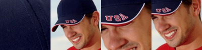 100% cotton twill • mid-profile • 6-panel • structured • contrast button and sewn eyelets • USA embroidered on left corner of visor • white piping on visor edge • contrast sandwich • self-fabric self-adhesive closure • 4"w x 2"h imprint area • Sizes: one