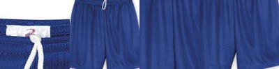 100% polyester, 70 denier mesh with solid tricot liner • Athletic cut • Superior fit • Covered elastic waistband and draw cord • Six-inch inseam • Sizes: S-L