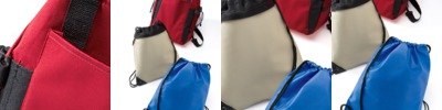 600-denier polyester/PVC • pull string main compartment for a drawstring pack • double reinforced box-stitch handles to carry as a tote • business card holder on back • mesh water bottle holder on each side • 5"w x 10"h approx. imprint/embroidery area • Size: 12 1/2"w x 17"h x 5"d