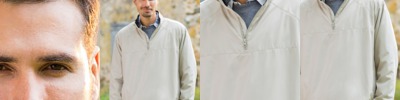 100% polyester • 2.5-oz. • wind- and water-resistant • 1/4-zip • mesh-lined • 2 lower zip pockets • bungee cord at bottom with 2 stoppers • Sizes: S-4XL
