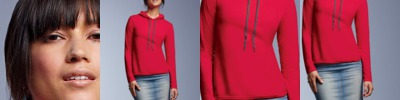 preshrunk 100% ring-spun cotton (blended ring-spun cotton/polyester in heather colors) • 30 singles • 4.5-oz. • missy contoured silhouette with side seams • display tape • relaxed unlined hood with contrast draw-cord • double-needle neck • sleeves and bottom hem • tear-away label • Sizes: S-2XL